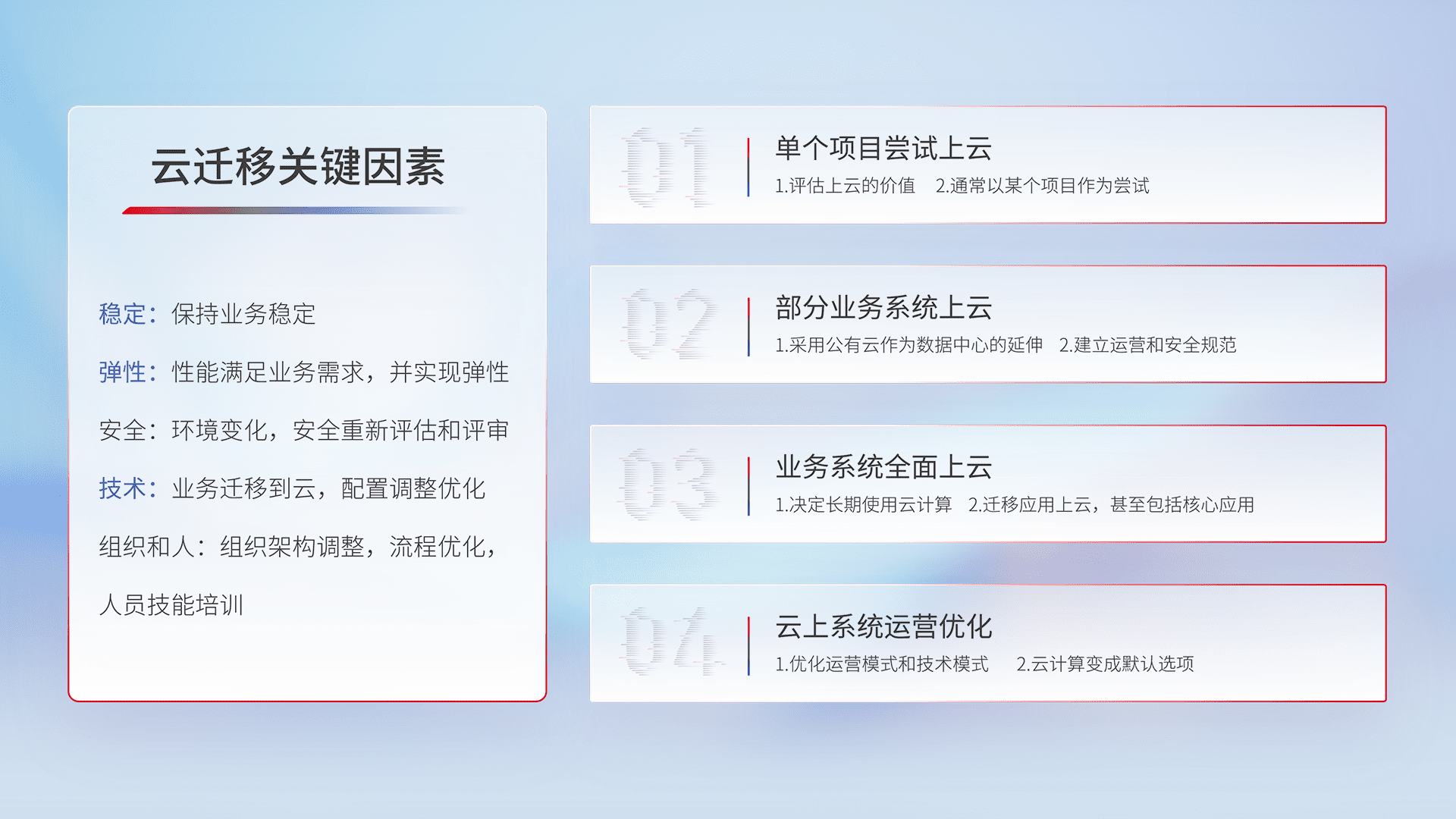 结合实际业务,,,从规划设计、、、云平台选型、、、、云原生改造、、数据迁移、、、、集成交付,,,,迁移全过程为客户识别最佳上云路径,,,做好风险识别管理,,,设计网络架构、、、身份权限、、安全审计合规、、、、操作审计、、、、日志审计、、监控告警策略、、多站点容灾设计等,,,对云上基础设施进行整体规划,,,,提升IT治理水平,,,以满足弹性、、、高可用、、、、高性能的需求。。。。