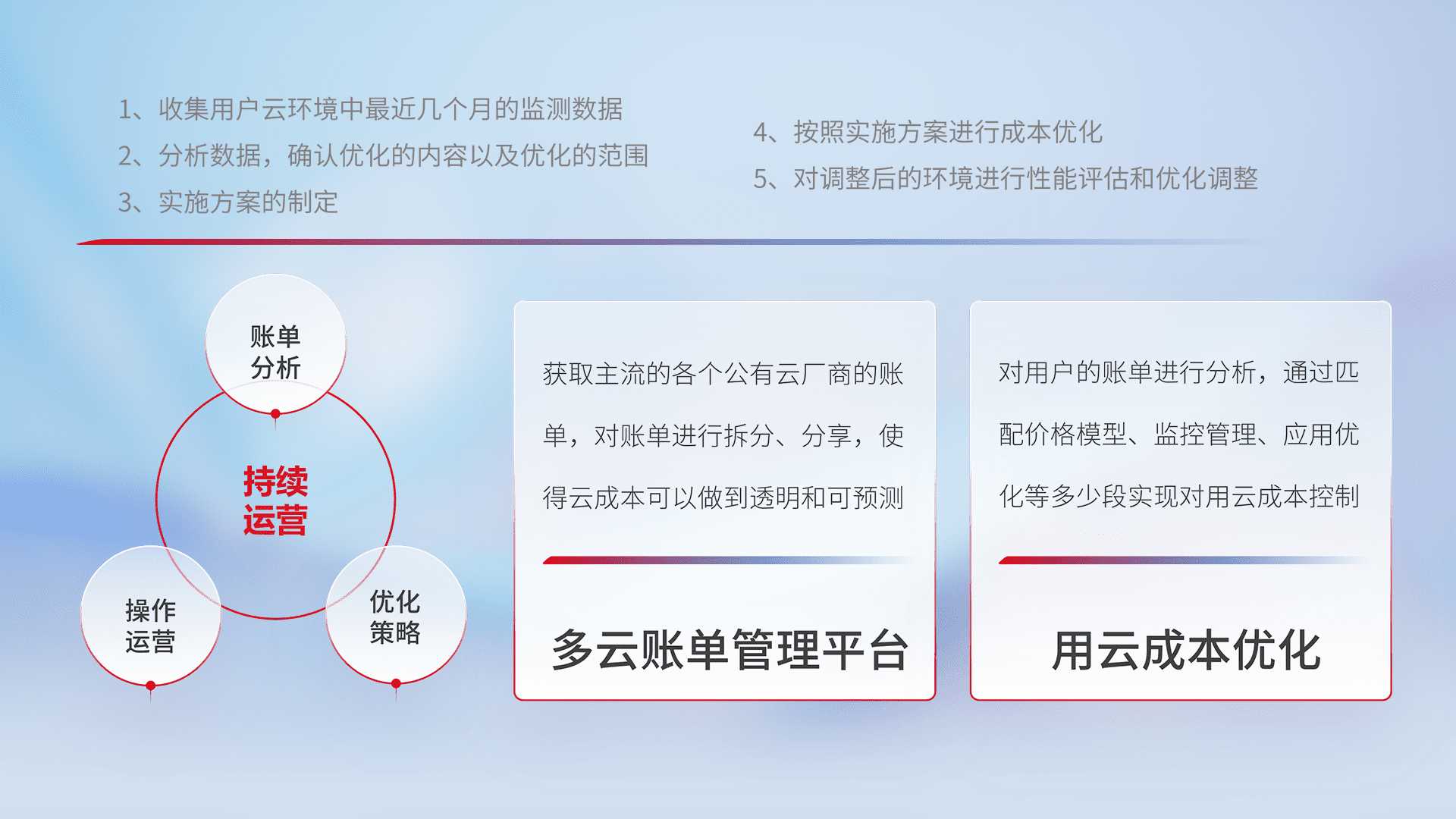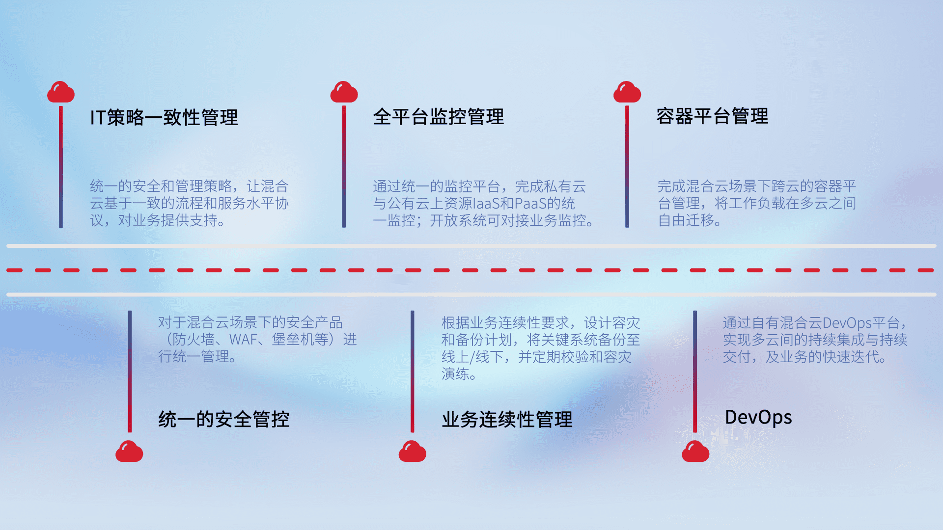 通过多云纳管,,以统一的资源数据模型把客户的云资源进行抽象和封装,,,,进而实现对多云资源的统一操作,,,,保障云资源管理的可靠性、、、稳定性与可用性。。量身定制化运维内容,,,配置、、开发运维、、、、补丁管理、、、、备份、、监控、、、、认证和访问管理、、、、审计和日常巡检等,,,保障在用云过程中的可靠度,,,,稳定度以及高可用率。。